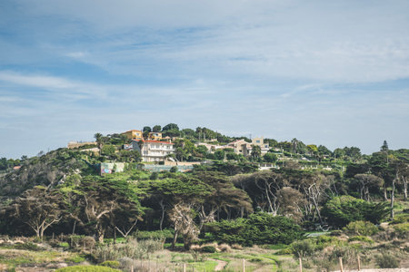 Scenic view of a winding road amidst lush vegetation, leading up to hillside villas with breathtaking views of the Mediterranean sea in Costa Rei, Sardinia, Italy