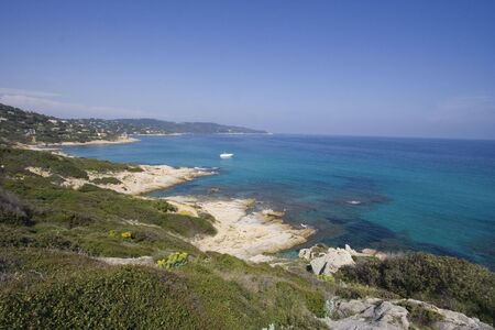 View of the coastline near Saint-Tropez, Cote d'Azur, France. The town is a worldwide famous resort for the European and American jet set and tourists