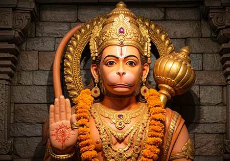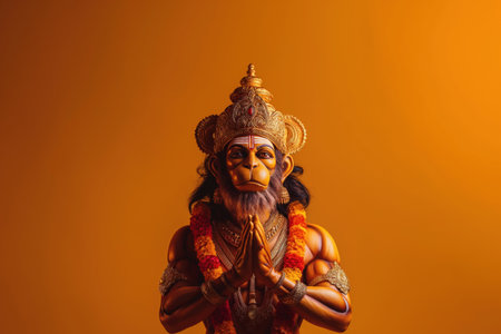This close-up image showcases Hanuman, a revered Hindu deity, depicted in a vibrant orange and gold statue. Generative Ai