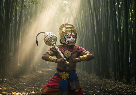 A captivating image of a Hanuman devotee in elaborate traditional costume, performing a dance or ritual within a serene bamboo forest. Generative Ai