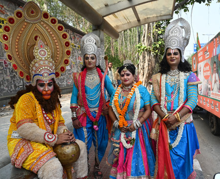 NEW DELHI, INDIA - MAY 23: Artist dress up as a lord Ram, Mata Sita and lakshman, and Hanuman Participating with Union Minister of Women and Child Development Smriti Irani road show in the support of chandhi chowk lok sabha election BJP candidate Praveen