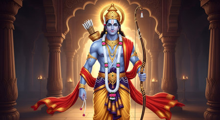 A Blue divine archer holding bow standing in ancient temple hallway with glowing lamps representing Ram Navami Diwali Dussehra and Hindu spiritual celebration