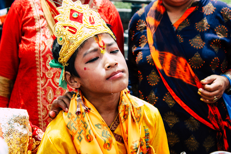Kathmandu Nepal August 27, 2018 View of unknowns Hindu people attending a religious ceremony with a holy cow at the Pashupatinath temple in the morning