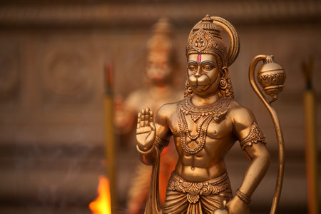 Majestic Hanuman statue in dim temple light, divine symbolism. generated by ai