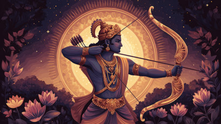 A powerful depiction of Lord Rama pulling back his bow, symbolizing the victory of good over evil, celebrated during the Dussehra festival.