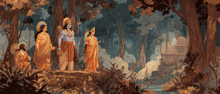 Epic forest exile scene with Lord Ram, Sita, and Laxman from ancient Ramayana mythology.