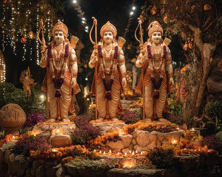 Statue of Ram, Sita, Laxman, Hanuman lit with Diwali lights, clay lamps and festive flowers.