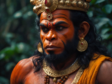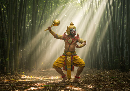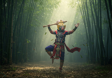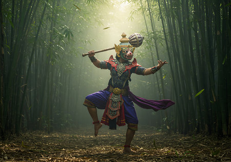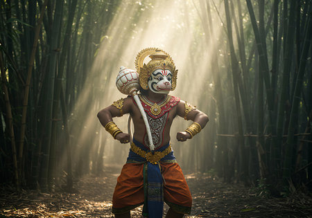 A captivating image of a Hanuman devotee in elaborate traditional costume, performing a dance or ritual within a serene bamboo forest. Generative Ai