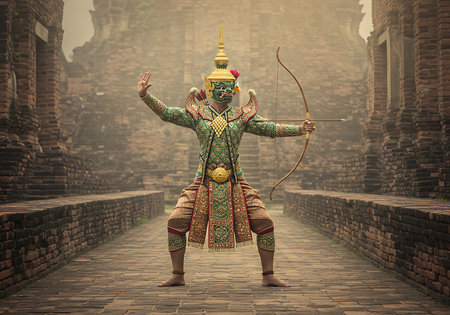 A captivating image of a Hanuman dancer, a traditional Thai masked dance, dressed in elaborate, vibrant costumes, poised in a dramatic pose with a bow and arrow. Generative Ai