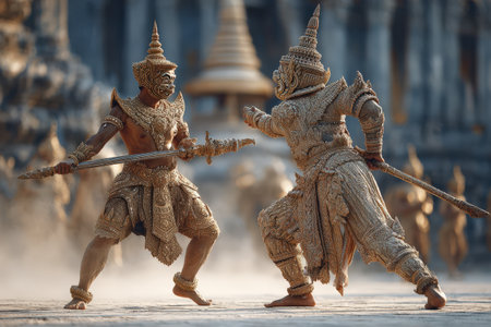 Two skilled warriors in elaborate costumes are locked in combat, surrounded by an ancient temple backdrop, highlighting the rich textures and cultural significance of the scene