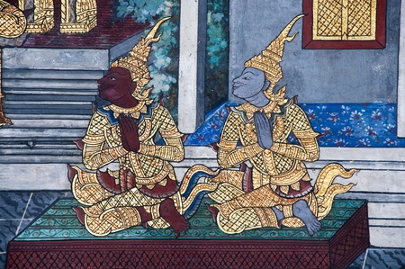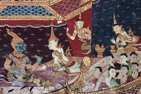 Ancient Thai mural painting of Ramakien epic inside of Wat Phra Kaew in Bangkok, Thailand.Ramakien is national epic of Thailand derived from Hindu Ramayana epic.
