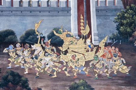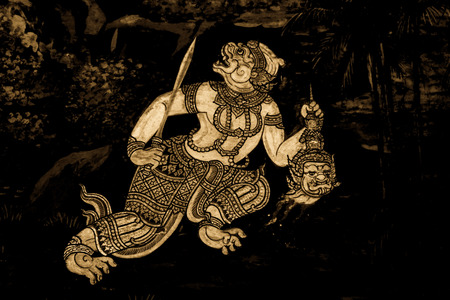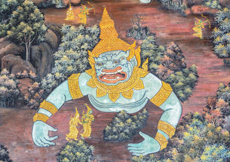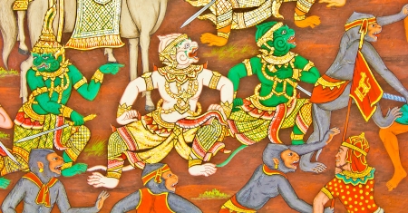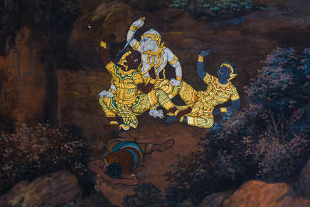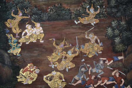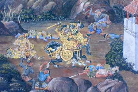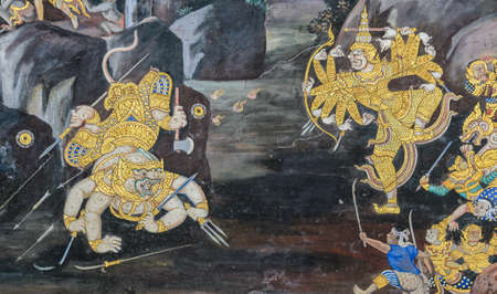 Ancient Thai mural painting of Ramakien epic in Bangkok, Thailand.Ramakien is national epic of Thailand derived from Hindu Ramayana epic.