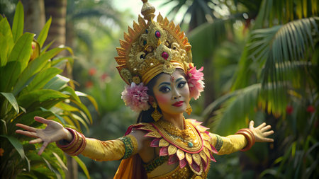 A dynamic image of a person in elaborate traditional Indonesian hanuman dance costume, likely a form of Wayang dance, performing a spirited dance move in front of ancient temple ruins. Generative Ai
