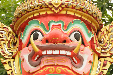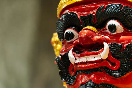 Closeup face of giant statue in public Thai temple, character in Thai folk tale