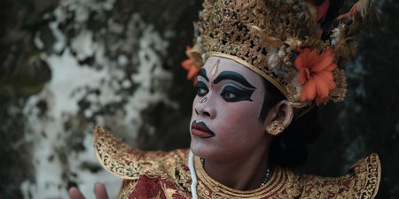 Traditional Balinese costume and mask Tari Wayang Topeng - characters of Bali culture. Temple ritual dance at ceremony on religious holiday. Ethnic festivals, arts of Indonesian people