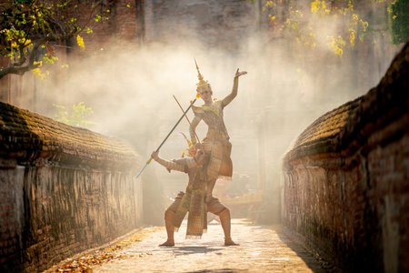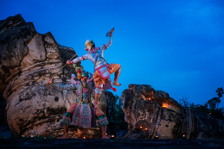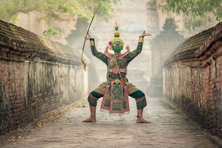 Khon or traditional Thai classic masked from the Ramakien characters action of traditional dance with fighting between human and giant with ancient building as background in public place.