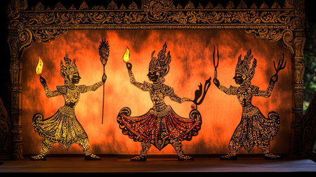 A captivating shadow puppet performance showcasing intricate designs and vibrant colors against a beautifully illuminated backdrop.