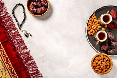 Ramadan Kareem background. Islamic rosary and dates fruits with tea