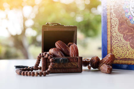 Food Ramadan dry dates or kurma with Quran and rosary. Month fasting culture Muslim and prayer for god, Ramadhan food symbolic eastern Arabian. Islamic concept.