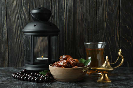 Concept of Ramadan with food and accessories against wooden background
