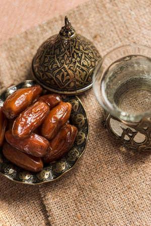 Still life with dates and a glass of water. Ramadan concept.