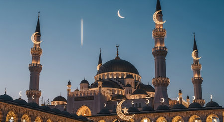 A symbol of faith and tranquility. This image captures the beauty of an Islamic place of worship during the golden hour, featuring a clear crescent moon, representing hope and new beginnings.