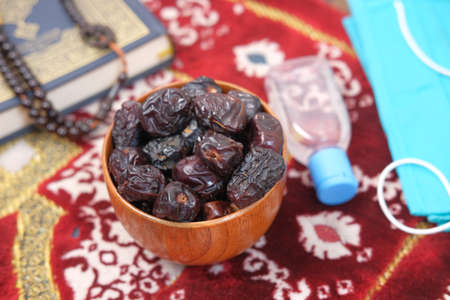 fresh date fruit in a bowl , prayer rosary , hand sanitizer and mask on floor