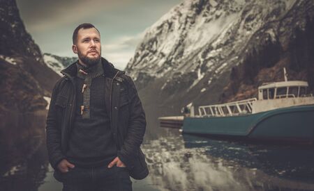 Photographer with camera on the background of the mountains. A man with a beard in a hat and a black jacket.
