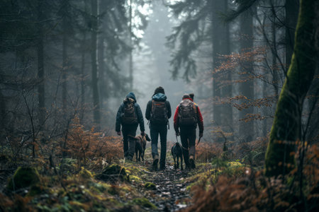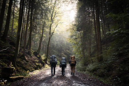 Autumn adventure hiking with friends in a forest nature photography serene environment group view
