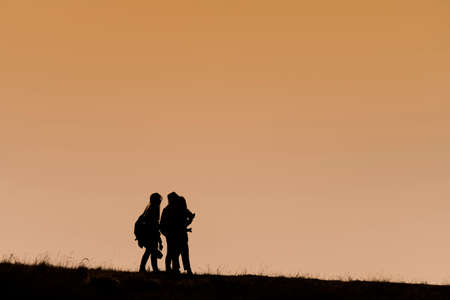 Silhouettes of hikers with backpacks enjoying sunset view from top of a mountain, Silhouette tourists and photographers with beautiful sunrise