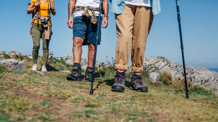 Group of three people practicing trekking outdoors. Selective focus on man in background