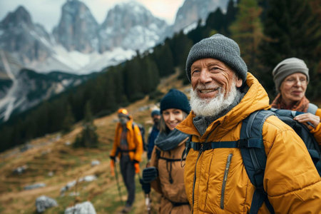 a group of nature enthusiasts hike through a picturesque mountain range, wearing sustainable hiking gear