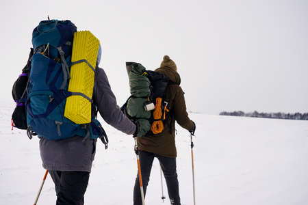 Two guys walk through loose snow during a winter expedition. They carry large backpacks, warm jackets. They hold trekking sticks in their hands.