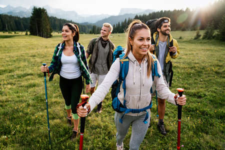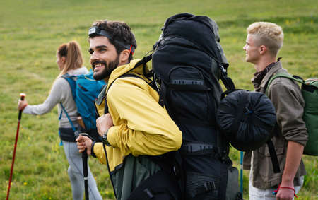 Adventure and hiking. Group of young people make a hike in mountains. Active lifestyle. Tourist equipment.
