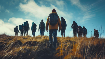 A group of diverse individuals is seen hiking up a rugged trail in a mountainous area. The hikers are dressed in outdoor gear and are carrying backpacks. They are actively trekking forward, surrounded by lush greenery and rocky terrain.