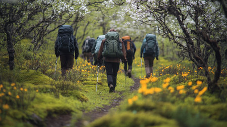 Hikers traverse a vibrant forest path, surrounded by greenery and blooming wildflowers. The group carries backpacks and uses trekking poles as they enjoy nature's beauty.