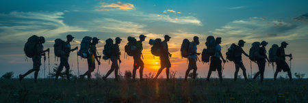 Hiking group enjoying mountain trek at sunset in summer, embracing nature and outdoor activities.