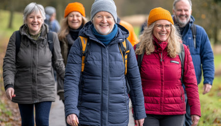 Group Of Active Senior Friends Enjoying Nature Walk In The Park, Promoting Healthy Lifestyle