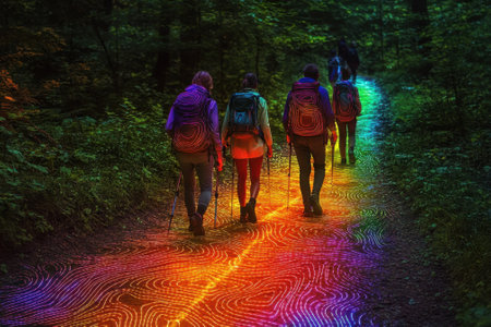 Groups of hikers walk along a forest trail marked by glowing, colorful patterns on the ground.