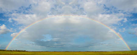 Rainbow in the blue sky with clouds and sun rays, nature background