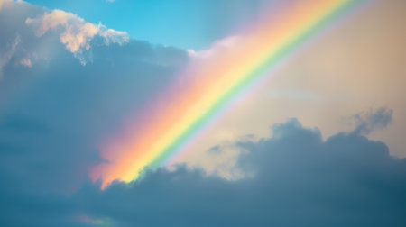 A stunning rainbow displays seven colors against a backdrop of clouds, creating a mesmerizing natural spectacle.