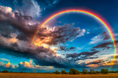A vibrant rainbow spans across dark, moody clouds illuminated by the fading light of sunset, showing natures beauty after a rainstorm.