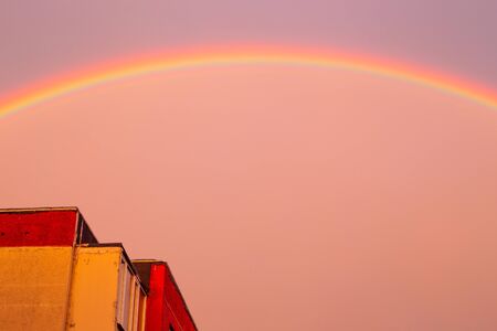 Bright colorful rainbow over, sun shining in rainy day, beautiful colors phenomenon sky, overcast weather, multi-storey residential buildings, summer season