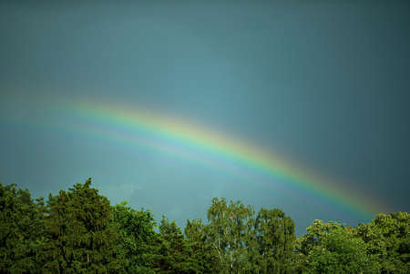 A multicolor rainbow against a dark cloudy sky on a summer day,