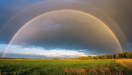 A stunning display of a rainbow arching gracefully over a golden field, surrounded by dramatic clouds, evokes peace and tranquility in nature