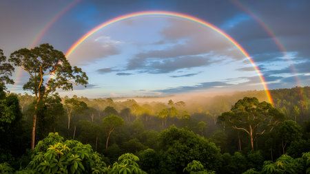 A breathtaking double rainbow arches over a lush tropical rainforest at sunrise or sunset. Mist clings to the canopy of the dense jungle, creating a magical and colorful landscape scene.