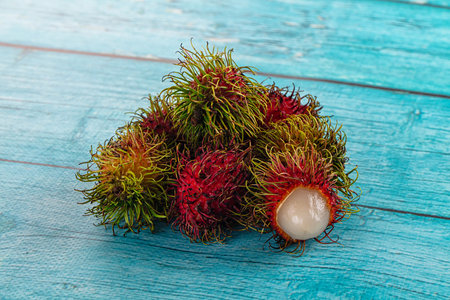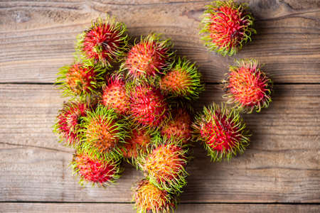 Rambutan fruit on wooden background. Rambutan is a tropical fruit native to Asia.