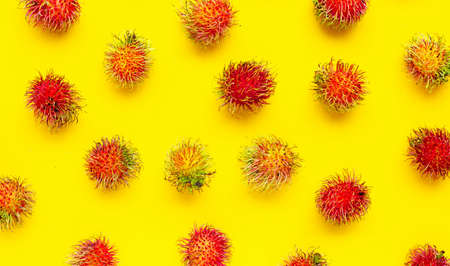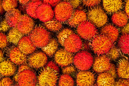 view of a bunch of red, yellow and green rambutan fruits with the spiky skin at local Asian farm market. Rambutan backgrounds.
