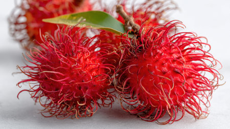 Discover the striking appearance of rambutan fruits, showcasing their unique hairy red shells and vibrant green leaves, symbolizing tropical abundance.