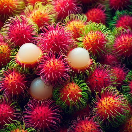 Discover the vibrant beauty of rambutan fruits in this close-up image, showcasing their unique textures and colors, perfect for food lovers.